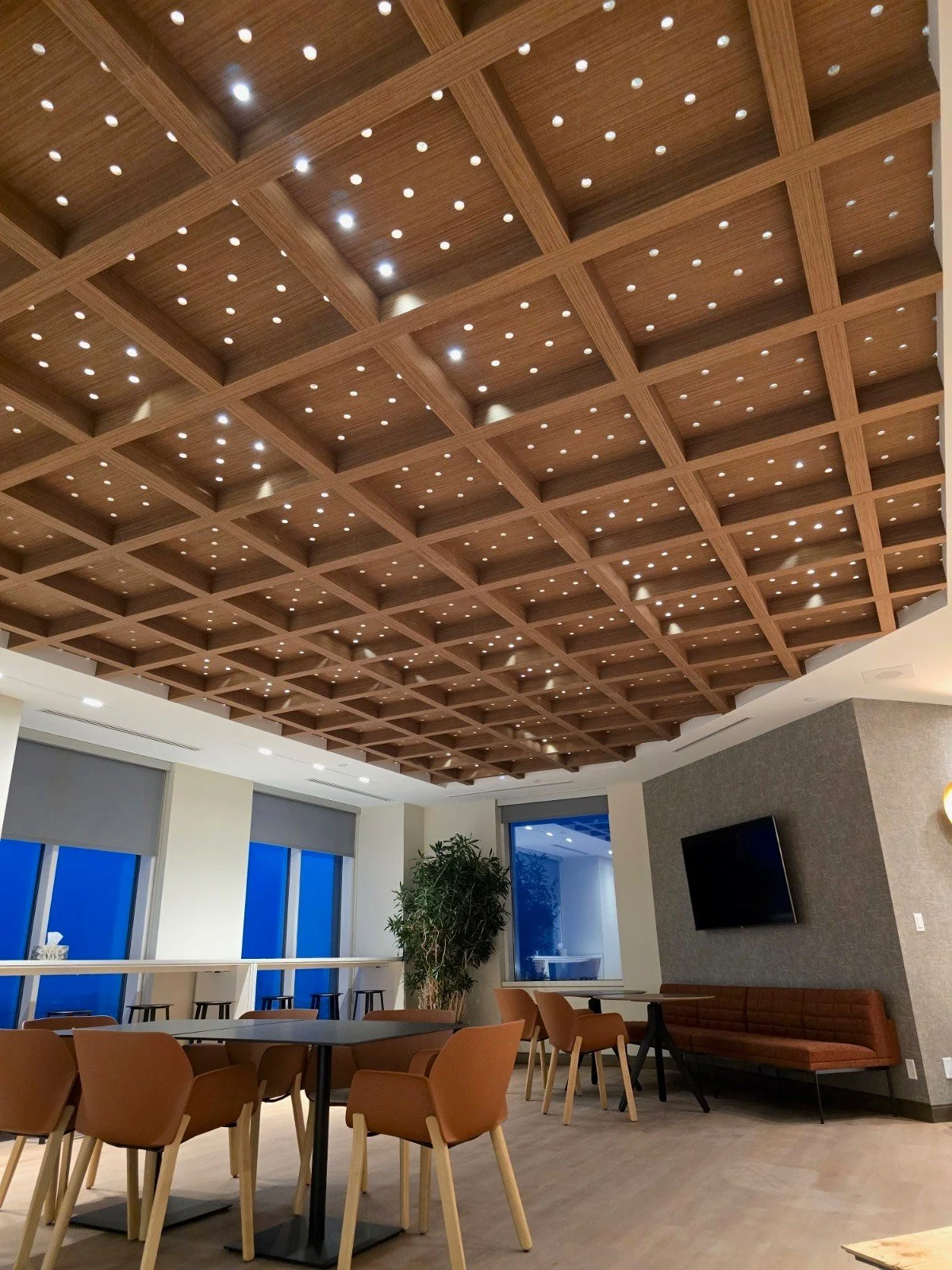 This project uses Arktura’s SoftSpan 24 system, a ceiling made from Soft Sound material to help absorb noise and make the space more comfortable. For this design, we created special perforated infill panels to let light pass through while still keeping the acoustic benefits. The result is a warm and modern ceiling that looks beautiful and improves the sound in the room.